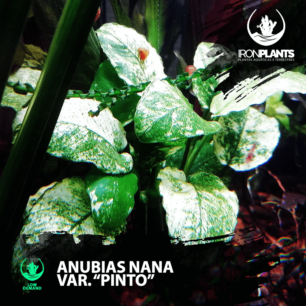 A Anubias barteri var. nana ‘Pinto’ (ou ‘White’) é uma variedade rara e muito cobiçada da Anubias Nana, resultado de uma mutação selecionada. Sua principal característica é o padrão de variegação espetacular de suas folhas, que exibem manchas irregulares de branco ou verde-claro sobre um fundo verde escuro, criando um efeito marmorizado. Nenhuma folha é igual à outra. Ela mantém todas as qualidades que tornam as Anubias tão populares: é extremamente resistente, de crescimento muito lento e ideal para baixa iluminação. Deve ser fixada a troncos ou rochas. Devido à menor quantidade de clorofila em suas áreas brancas, seu crescimento é ainda mais lento que o da Anubias Nana padrão. É uma verdadeira joia para colecionadores e aquaristas que desejam adicionar um toque de exclusividade e sofisticação ao seu aquário.