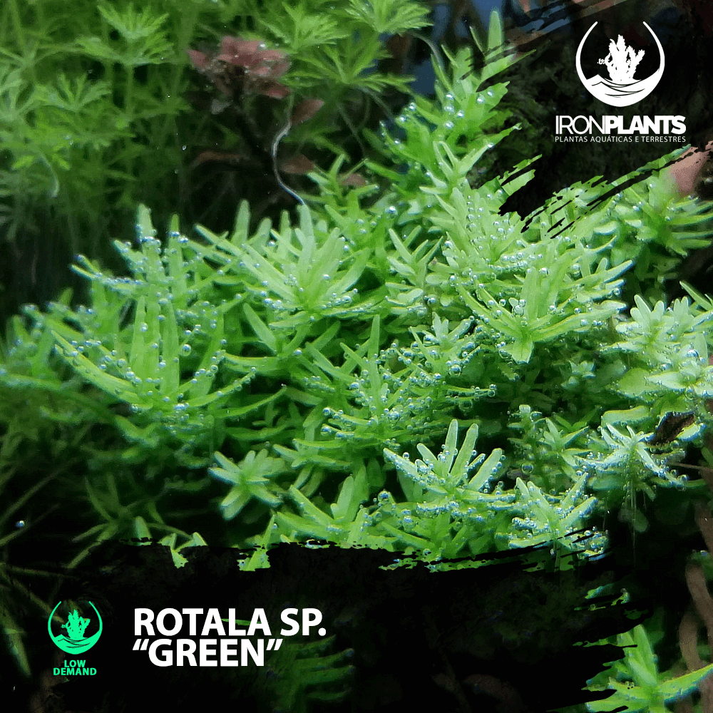 A rotala sp. ‘green’ é uma planta afíbia, original da Ásia de fácil manutenção e rápido crescimento. Ramifica-se ocupando um grande espaço lateral. Atinge facilmente a superfície da água a uma altura de até 50cm, por isso geralmente colocada no fundo do aquário. Planta com uma bela tonalidade verde sólido em suas folhas, permanece com as folhas verdes mesmo sob forte iluminação.